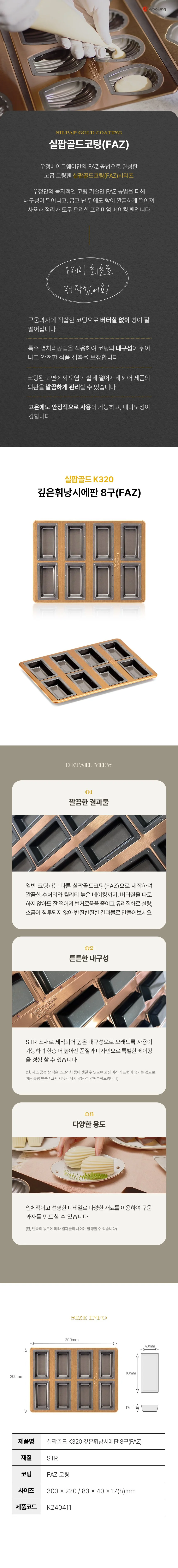 Product › K240411 실팝골드K320깊은휘낭시에판8구(FAZ) Image 1 of 2 Image 2 of 2 K240411 실팝골드K320깊은휘낭시에판8구(FAZ) USD 50.00 Size : 300×220 / 83×40×17(h) mm우정베이크웨어의 실팝코팅이 한 단계 더 업그레이드 되었습니다.실팝코팅에우정만의 'FAZ' 공법을더해 '실팝골드코팅'을새롭게출시하였습니다. Quantity: Add To Cart Added! Size : 300×220 / 83×40×17(h) mm우정베이크웨어의 실팝코팅이 한 단계 더 업그레이드 되었습니다.실팝코팅에우정만의 'FAZ' 공법을더해 '실팝골드코팅'을새롭게출시하였습니다.